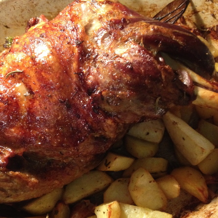 Quelques minutes avant de servir (dans un plat et des assiettes chauffées si possible!) retirez le manteau de l’épaule qui se la coulait douce et réveillez-là en la posant sur les pommes de terre, sous le grill, réchauffez le jus, découpez l’épaule et puis…bon appétit !