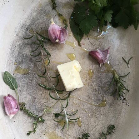 • Déposez-la ensuite dans un plat contenant des gousses d’ail en chemise, du thym, du romarin, un fond d’huile d’olive et du beurre..