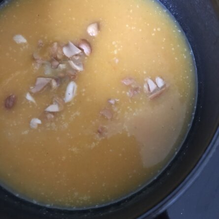 Ce jour-là, il me restait un peu de crème fouettée légèrement sucrée, je l’ai ajoutée au velouté ainsi que des brisures de châtaignes.
