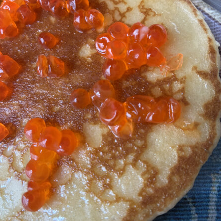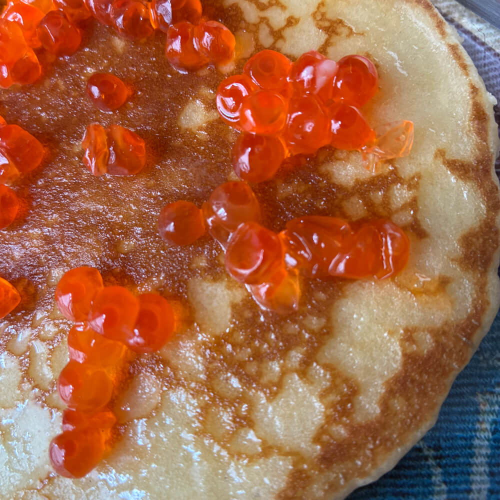 Pic-nique de luxe, un blinis chauffé dans le grille-pain poussiéreux, et des œufs de truite conservés sur le balcon