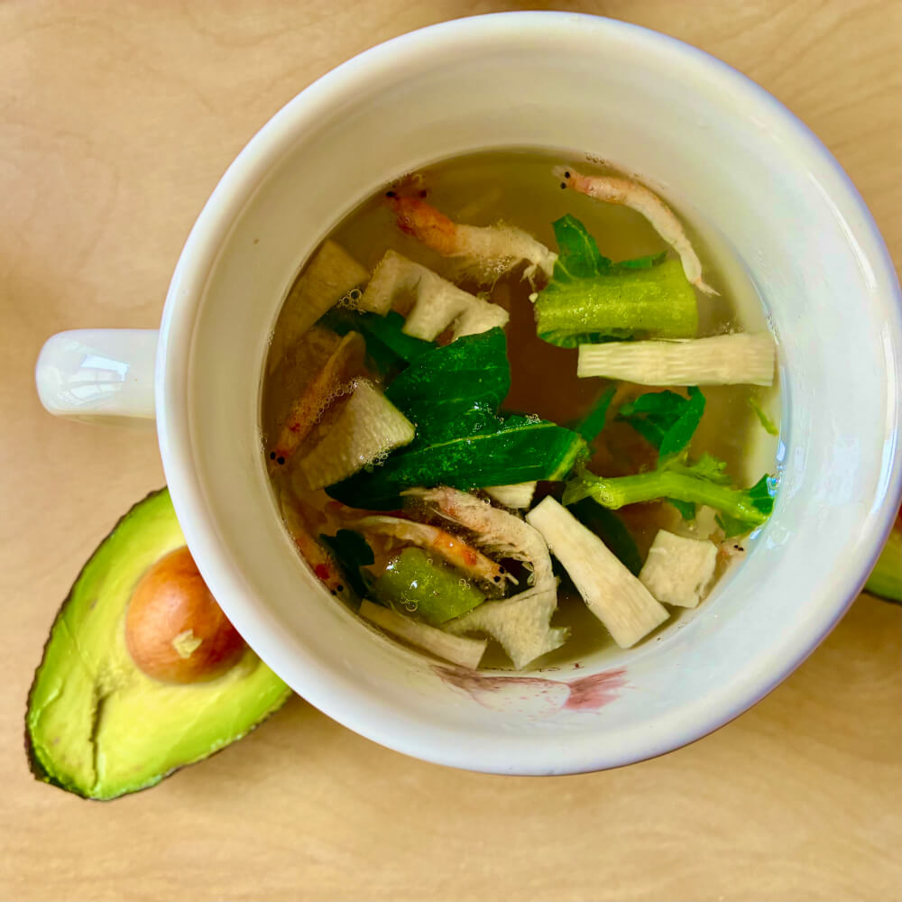 Pour se réchauffer: bouillon japonais réhydraté et un avocat. La bouilloire est sous une bâche