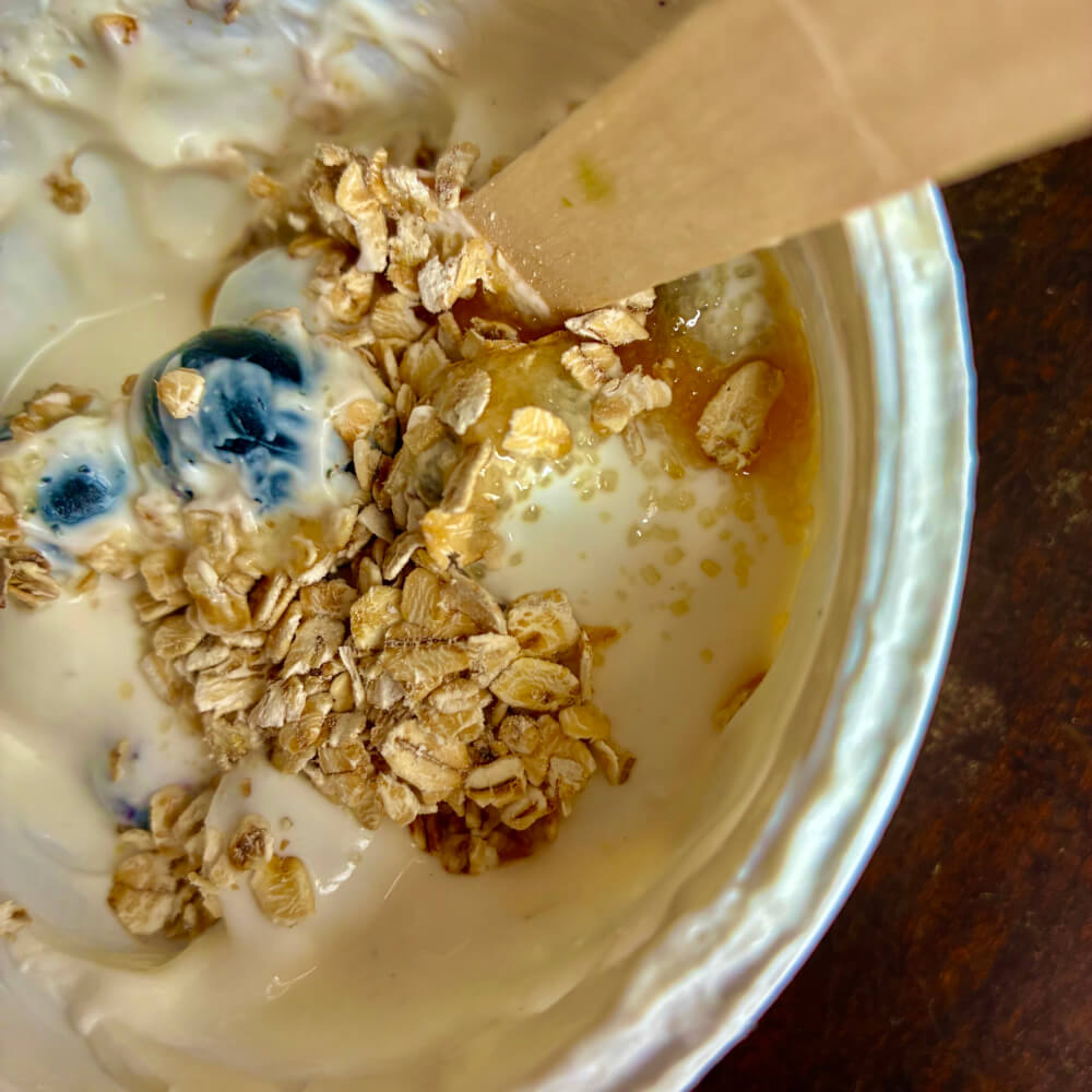 Yaourt grec, flocons d’avoine, blueberries sans saveur, cuiller en bois. Les dîners sont ailleurs et meilleurs!