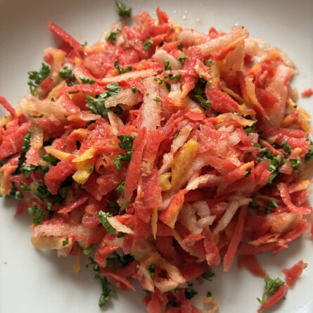 Menus du Vendredi 6 février 2026 Joli et bon Déjeuner Salade: carottes et pomme râpées au jus d’orange sanguine Crème de tofu soyeux au gingembre Chocolat noir Dîner Couscous suite et fin. Ajouté quelques rubis de grenade = bonne idée! Smoothie de mangue