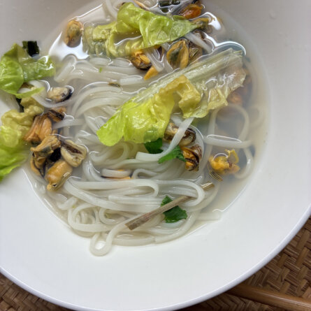 Soupe n°49 aux nouilles de blé tendre, coques et trompettes