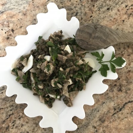 Menus du Dimanche 15 décembre 2019 Un mauvais portrait d’une très bonne « salade parisienne »: veau, lentilles, racine de cerfeuil, persil, moutarde, miam Déjeuner, de (bons) restes encore Salade: une variante de « La Parisienne« Fromage Tome de Savoie, pain khorasan grillé Melon Galia et confiture de melon Dîner