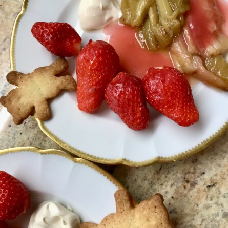 Fraises, crème fraîche, sablés, compote de rhubarbe cuite au four et coulis de rhubarbe (recette à venir!)