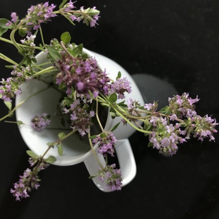 Thym serpolet si parfumé récolté en cheminant, effeuillé sur le plat de tagliatelle
