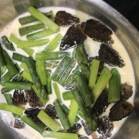 Menus du Dimanche 24 mars 2019 Les tagliatelle étaient un peu épaisses, mais ce fut un petit festin quand même Déjeuner, dehors Dîner, mmm… Asperges, morilles et tagliatelle à la crème Salade: pissenlits récoltés sur un versant au sud et lardons Fromages Salade de fruits: oranges et fraises Noisettes caramélisées d’un confiseur