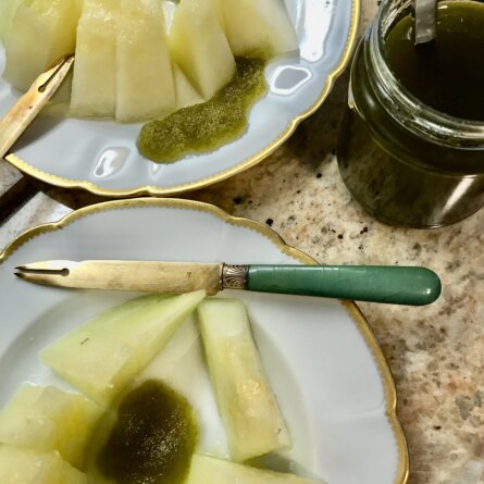 Délicate confiture verte, une spécialité du Marais Poitevin. Délicats aussi les couteaux à melon…