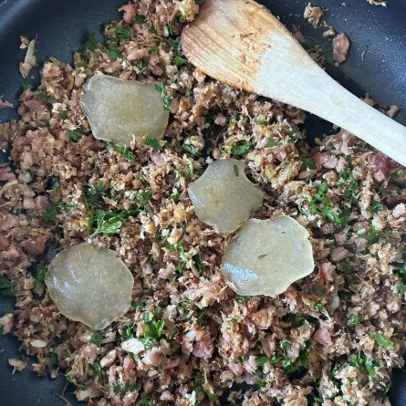 Pour mouiller le hachis de viandes (restes congelés d’agneau, veau, porc, canard, bœuf !): bouillon de queue de veau conservé en glaçons