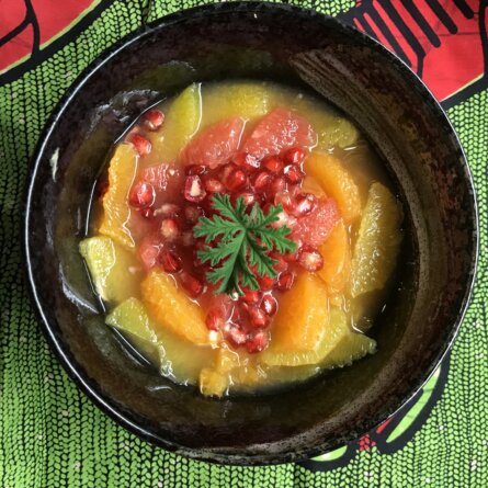 Menus du Dimanche 3 décembre 2023 …avec des rubis de grenade et une feuille de geranium rosat du balcon Déjeuner, hum…hum Dîner Bœuf bourguignon du congélateur, pas à la mode et si délectable Macaroni gratinés tout simples Salade d’agrumes: orange, pamplemousse, clémentines