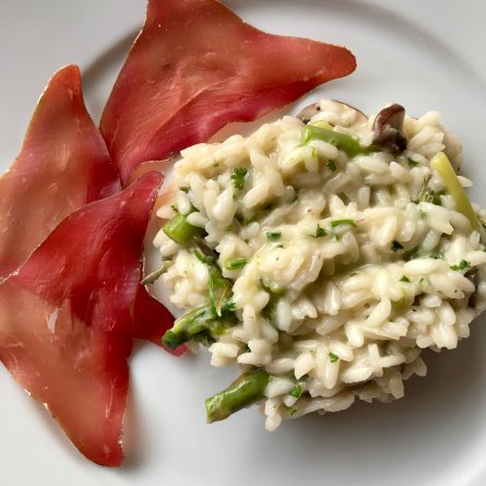 Menus du Dimanche 30 juin 2019 Le risotto: toujours un régal Déjeuner…au frais Œufs à la coque, pain beurré Fromage de chèvre, cette fois avec… La ratatouille simplifiée froide, miam! Pastèque Dîner Risotto aux asperges vertes et champignons de paris, quelques tranches de bœuf séché Salade: laitue rouge Fromages Salade de fruits: nectarines médiocres, pastèque, myrtilles de culture. Les sauvages seront mûres à la mi-juillet
