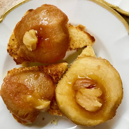Pommes rôties avec ou sans brioche. Sur le dessus, du caramel (conservé dans un bocal au réfrigérateur) fond doucement …