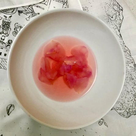 Menus du Jeudi 2 juillet 2020 …Cueillie en chemin. Ces rosiers généreux croulent sous les fleurs et s’écroulent par dessus les murets Déjeuner modeste Salade: pousses d’épinards et oranges Saucisson extra sec, pain beurre Abricots Apfelstrudel, suite et fin Dîner Tagliatelle aux asperges et morilles séchées, à la crème et au parmesan: délicieux Salade: chicorée tigrée locale Compote de cerises plus des framboises Testé un sirop de roses avec une seule rose…