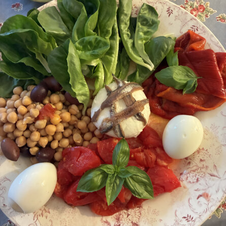 Laitue, pois chiches, olives, poivrons grillés,Tomate, œufs durs, mozarella, anchois…
