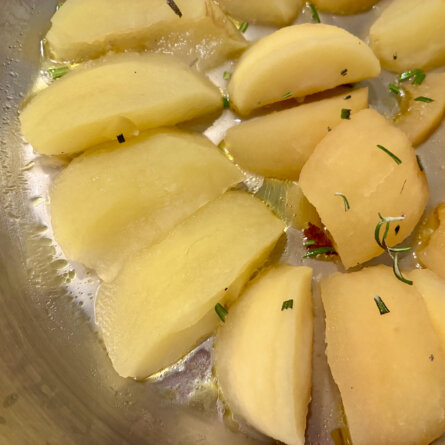Brins de romarin sur les pommes qui cuisent doucement dans la graisse du magret, rejointes par les marrons