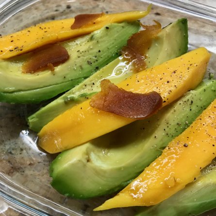 Sur le dessus, des lamelles de poutargue (un des bonbons de la cuisinière)