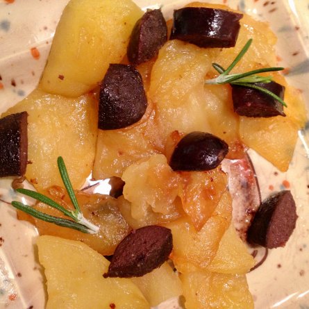 Menus du Jeudi 3 janvier 2019 Petits boudins en tranches sur pommes en tranches itou, doucement dorées + un brin de romarin qui ne nuit en rien Déjeuner Dîner, on continue à manger des restes Petits boudins et pommes suite et fin Endivettes Suite des nombreux fromages Salade d’oranges en suprêmes