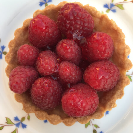 La pâte? voir recette, la MEILLEURE. Sur les framboises quelques gouttes de gelée de groseilles à froid (de 2023) refondue.