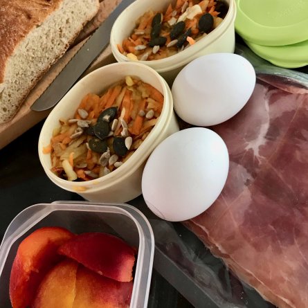 Menus du Lundi 21 juin 2021 Piquenique sous un arbre après la marche = le meilleur moment de la journée Déjeuner, pique nique Œufs mollets Salade: carottes et pomme râpées, pruneaux, graines de courges, jambon fumé Pain excellent Pêches italiennes, bonnes aussi Dîner Spaghetti Sauce tomate très améliorée avec des tomates indignes… Fromage: Chèvre frais, huile d’olive, thym sauvage Fraises locales