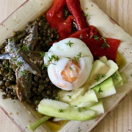 Menus du Lundi 22 juin 2020 Une ressource pratique: un reste de lentilles congelées. Voir d’autres salades d’été Déjeuner Salade: lentilles (du congélateur), poivrons (cuits) courgettes (crues), anchois au sel, œuf mollet Fromage de chèvre Abricots médiocres Dîner Beignets de morue portugais du marché, sauce tomate maison Pain et Gorgonzola Cerises