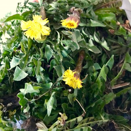 Menus du Lundi 25 mars 2019 Sur l’adret, il fait chaud. Apparaissent pissenlits et tussilages (fleurs jaunes sur la photo) à ajouter à la salade Déjeuner, en balade sur l’ubac (versant nord) Dîner très bon Clafoutis avec une sorte de reblochon local Salade de pissenlits récoltés sur l’adret (versant sud), sans œufs Pommes râpées, amandes et noisettes