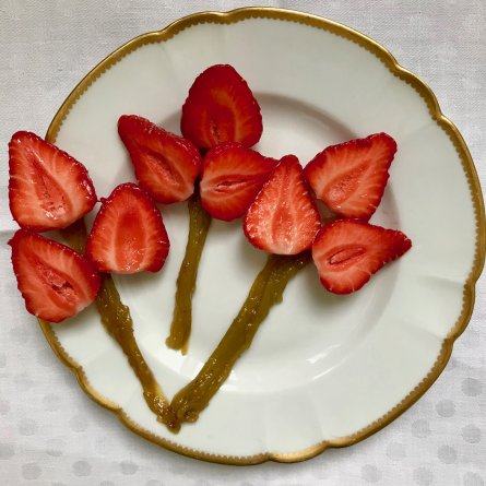 Menus du Lundi 29 avril 2019 Fraises en branches, branches de rhubarbe… Déjeuner plaisant Spaghetti à la sauge Fraises et rhubarbe confite, plus crème Dîner, la flemme