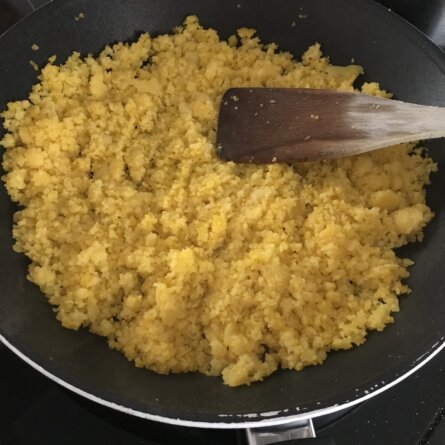 Tourner souvent jusqu’à ce que les miettes de polenta « grillottent » un tantinet