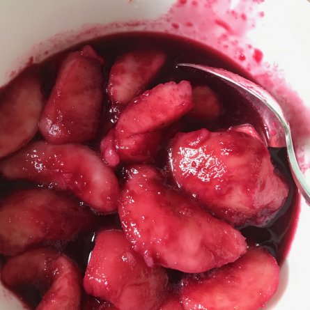 Menus du Lundi 31 août 2020 Triche: c’est la photo de la veille parce les pêches se sont oxydées et virent au brun même sous le coulis de cassis! Déjeuner Spaeck avec des figues fraîches Haricots verts sautés Noisettes grillées Dîner Salade: Thon en boîte, cocos de Paimpol, Tomates, Poivrons doux grillés Fromages: Gorgonzola, Munster Pêches pochées au coulis de cassis, suite et fin … 2 heures plus tard: 1 cuillerée de beurre de cacahuètes, un péché inavouable. Elvis Presley en serait mort…