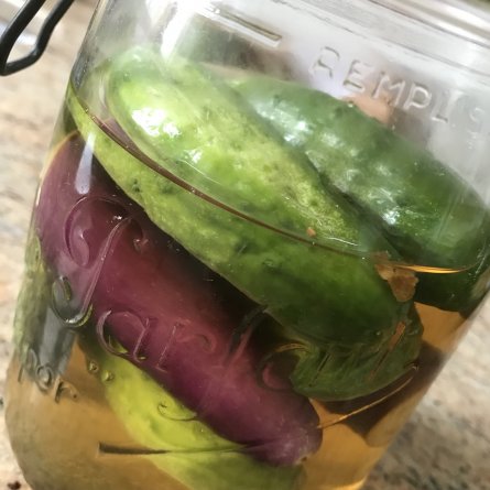 Version estivale des légumes marinés: gros cornichons, 1 aubergine mauve en attendant d’autres locataires pour le bocal