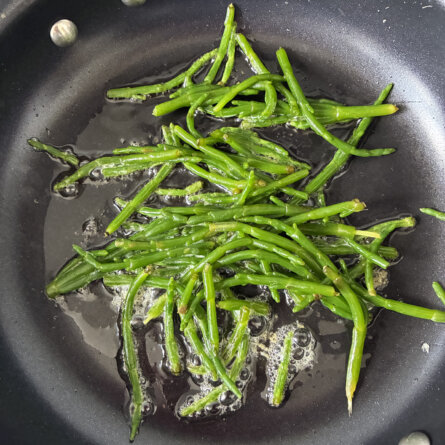 Menus du Lundi 9 juin 2025 Une poignée de salicorne pour essayer. Sautée comme des haricots verts. Croquant, amusant. Déjeuner Œuf mollet, pain grillé Salicorne sautée Cerises Dîner Melon Spaghetti au citron Mayonnaise au chocolat. Trop bon