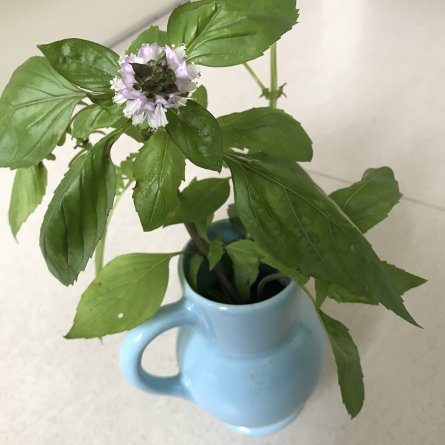 Menus du Mardi 10 septembre 2019 Le basilic a pris racine dans les 5 mm d’eau que contient le pot Déjeuner Salade de tomates Nouilles japonaises (soba) aux légumes: courgette, shitake, carotte, basilic Raisin Dîner