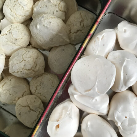 Anis bredele et petites meringues. Reste à faire les Zimmet Sterne. À apporter le 24. Total : 60 biscuits
