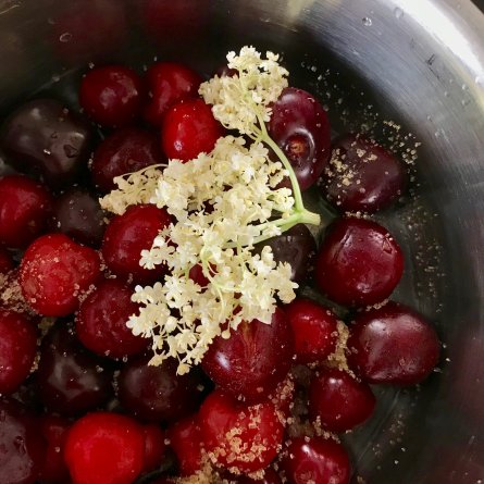 Menus du Mardi 2 juillet 2019 La charmante ombelle de sureau parfumera légèrement le jus des cerises… Déjeuner Salade fenouil thon Yaourt au lait brebis avec la compote de rhubarbe (le reste), de la bonne confipote de mauvais abricots (méthode de la rhubarbe du 29 juin) et des myrtilles Dîner Spaghetti sauce tomate maison Salade ramassée à la fraîche Cerises cuites