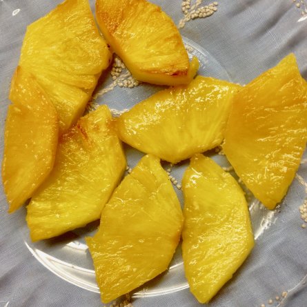 Menus du Mardi 27 novembre 2018 1 lichette de beurre, 1 de sucre, 3 gouttes de jus de citron, le jus qui coule du fruit, et hop! Déjeuner Petite salade de restes à la sauce japonaise (soyu, vinaigre de riz): riz, épinards, chanterelles Beignets de morue portugais du marché Myrtilles et fromage blanc Dîner Côtelettes d’agneau Pommes de terre à la suisse avec du beurre Ananas poêlé qui change de l’ananas, avec des spéculos