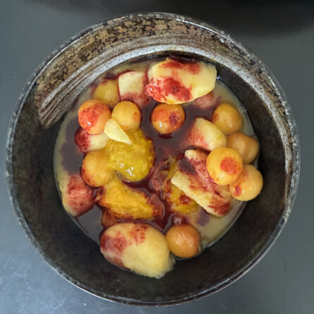Menus du Mardi 29 juillet 2025 Les cerises Rainier sont délicieuses. Versé sur la compote un coulis fraises/ mûres Déjeuner: pizza réchauffée à la poêle. Parfait Dîner Melon au vin doux Maury Poivrons farcis du 26, réchauffés Semoule Compote: pêches, reine- Claude, cerises Raignier (jaunes et rouge ressemblent aux « Napoleon »)