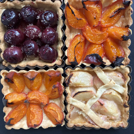 Faites avec un reste de pâte rustique surgelée. Pour les cerises qui cuisent vite, on peut précuire la pâte (cailloux pas nécessaires)