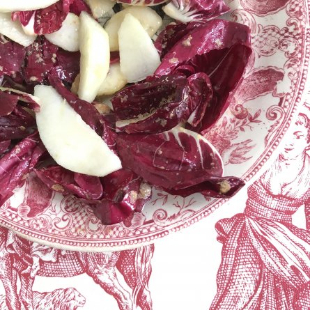Menus du Mercredi 30 octobre 2019 Un mariage réussi: une poire de la variété « Gourmande » très juteuse et sucrée avec la trévise, un peu amère Déjeuner Salade de Trévise aux poires Un soupçon de tendron, le reste de son jus, avec des pommes de terre …comme dessert: une tasse de chocolat à l’eau ! Dîner
