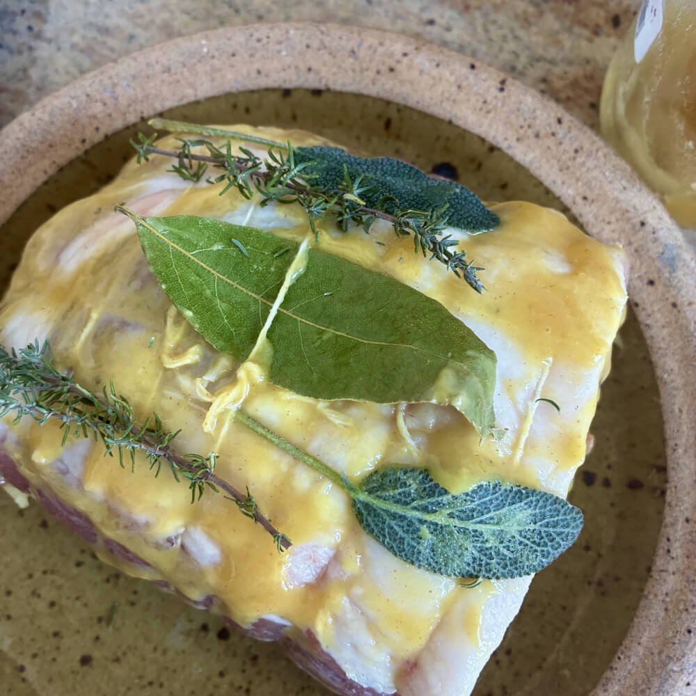 Enduire la palette d’un mélange de moutarde et de miel et hop! dans le Römertopf. Un morceau d’une tendreté rare!