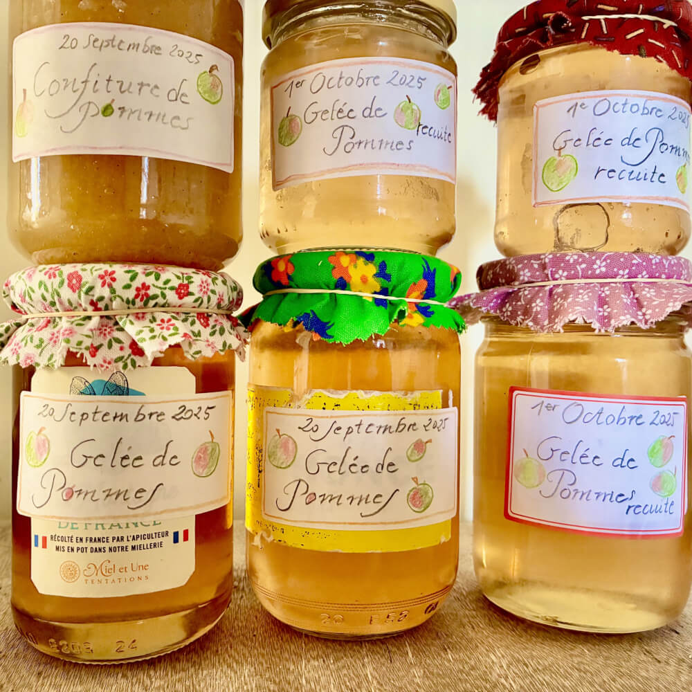 Mise en pots de la gelée de pommes et d’une confiture de pommes itou. Une première! Recette à venir