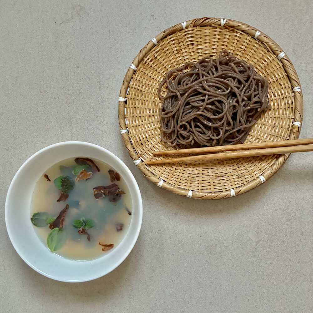 Le bouillon pour tremper les nouilles: jus de moules, quelques coques décongelées, 3 petits morceaux de ceps. Le Graal