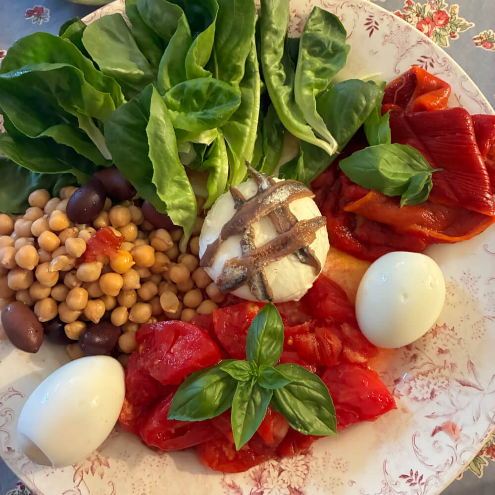Laitue, pois chiches, olives, poivrons grillés,Tomate, œufs durs, mozarella, anchois…