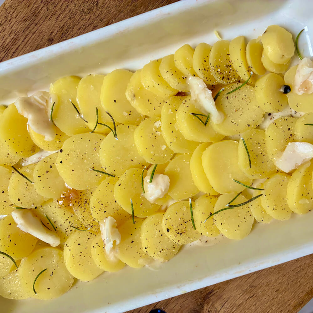 À la graisse de canard + un peu du jus restant dans le bocal (menu du 10 août). Et hop au four!