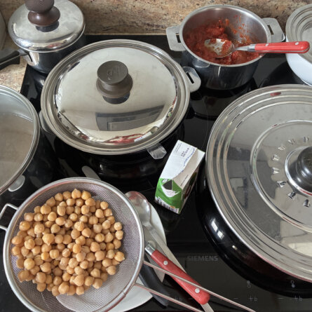 • Ajouter le lait de coco, la sauce tomate, les lentilles cuites et les pois chiches itou. Laisser mijoter 15 minutes environ ou plus.