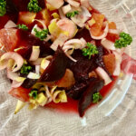 Restes de veau et de poulet froids du congélateur et beaucoup d’herbes: graines de basilic séché, basilic frais, menthe, thym, persil, romarin frais. Pour le reste, opéré comme d’habitude