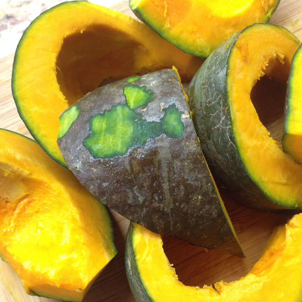 Il n’ y a pas beaucoup de différence entre cette variété de potimarron Hokkaido ou Kabosha et la variété orange, elle est parfois plus sucrée avec un goût plus prononcé de châtaigne. La seule différence c’est la surprenante couleur olivâtre du velouté dans votre bol…