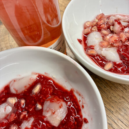 Framboises et litchies, le grand amour. Arrosé de sirop de mauve local. Très raffiné…