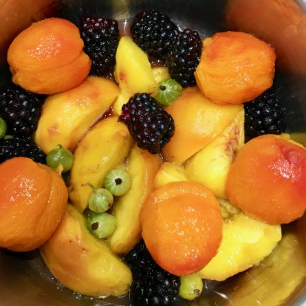 Menus du Samedi 11 juillet 2020 Jolie et même bonne… Déjeuner, des sandwiches dehors, car… il pleut et en raison des mesures sanitaires, difficile de trouver une place assise Dîner Melon Ribelli, dernière poêlée Ratatouille- sorte de-dans un wok: aïe, légumes « hors sol »… » Compote de fruits pochés: pêches, abricots, plus des mûres et les groseilles à maquereau sauvages, savoureuses