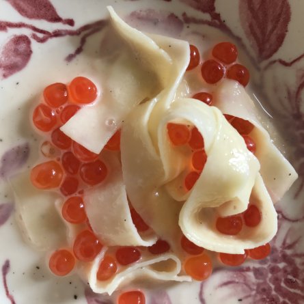 La dernière bouchée…tagliatelle, œufs de saumon pour finir le pot, crème. Très bon