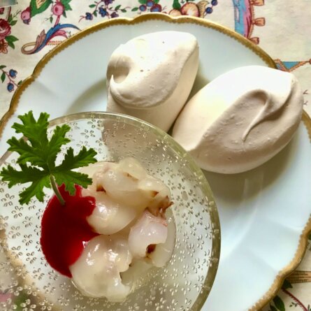 Menus du Samedi 23 décembre 2023 Un coulis surgelé qui ne vaut pas un coulis maison mais pratique…Une feuille de géranium rosat Déjeuner, un autre petit goût de fête Langoustines décongelées, cuisson au cours bouillon, un achat de l’été quand c’était la pleine saison Mayonnaise Pommes de terre et carottes à la vapeur Litchies frais épluchés, coulis de framboises et meringues maison à la crème. Voir aussi ici